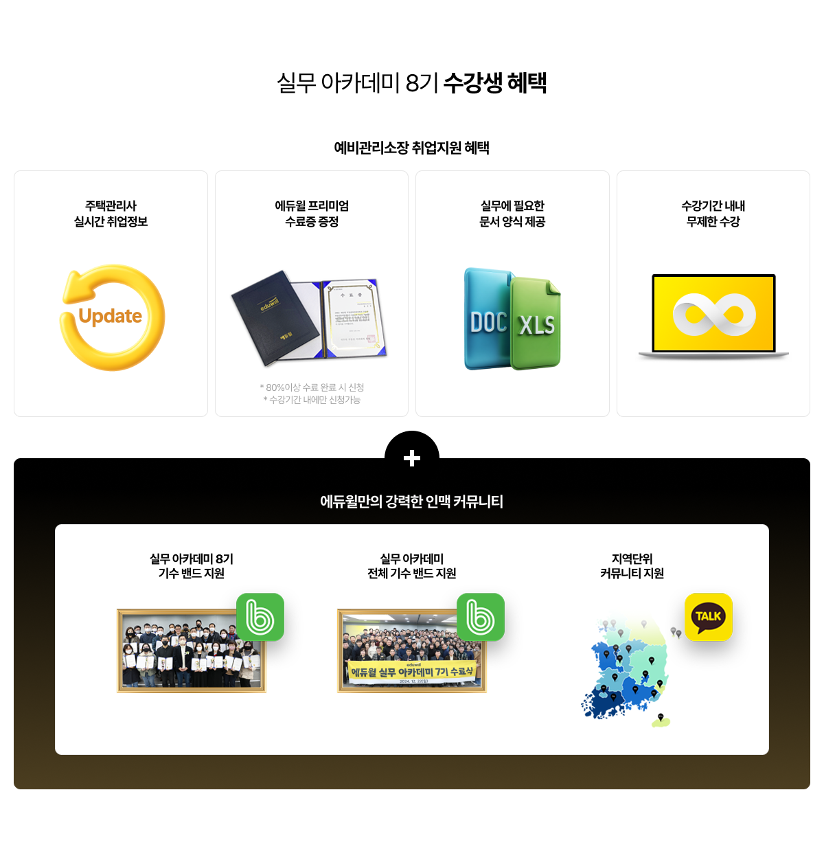 1. 에듀윌 프리미엄 수료증 제공 - 제공조건 : 80% 이상 수료시 신청 및 발급 가능 - 현장반은 수료식 당일 제공(12/21), 온라인반은 밴드를 통해서 신청 2. 25년 취업 설명회 및 복습용 온라인 강의 제공 3. 주택관리사 취업&실무 필독서 제공 (PDF) 4. 실무 아카데미 8기 밴드 초대권 제공 - 수업관련 공지사항 안내, 교수님과 질의응답, 회원간 커뮤니티 - 수강신청 후 개강 전 전체적으로 밴드 초대 문자 발송 예정 5. 실무 아카데미 8기 전체 기수 통합 밴드 및 지역단위 커뮤니티 초대 |