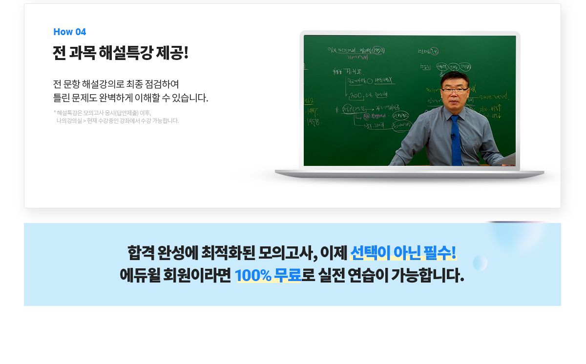 | 해설지 | 모의고사 응시(답안제출)직후, 나의강의실 > 모의고사 응시 및 내역에서 다운로드 가능 |