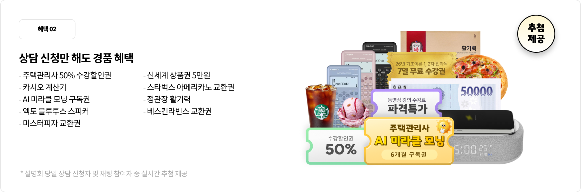 설명회 경품 혜택은 중복 당첨이 불가하며, 중복 당첨된 경우 금액이 가장 높은 경품 1종으로만 발송됩니다.