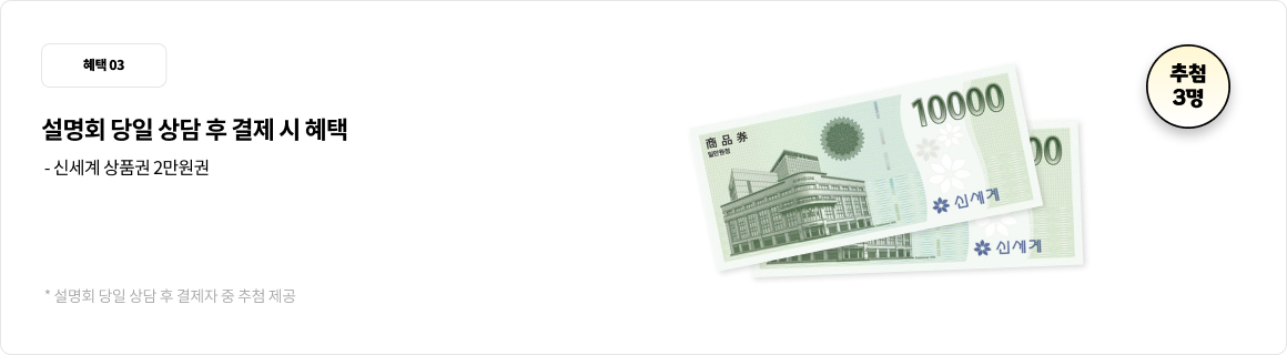 설명회 당일 상담 후 결제 완료 시 추첨 경품: 신세계 상품권 20,000원 (2025년 12월 1일 이내 지급)