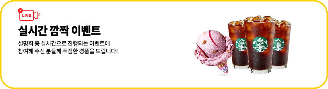 경품 추첨 결과는 별도 공지되지 않으며, 당첨자에게 회원정보에 기재된 휴대폰 번호 또는 설명회 방송 진행 시 입력한 휴대폰 번호로 모바일 쿠폰이 전송됩니다. (이벤트 종료 후 3주일 이내로 발송)