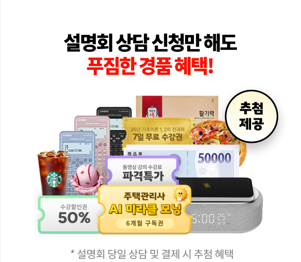 에듀윌 온라인 상품 1종 50% 수강할인권: 동영상 강의 정가 기준/교재비 별도(수강할인권 대상 상품은 설명회 시간에 확인 가능하며 당첨자에게 개별 안내 예정)