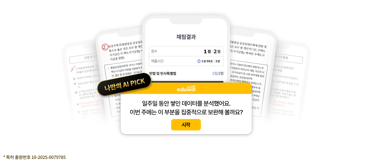 * 98%: 35회 공인중개사 시험 에듀윌 풀서비스 가채점 결과 동차합격자 대상 설문조사 ‘실제 시험문제와 에듀윌의 적중률은 어떠셨나요?’ 긍정 응답률(2024.10)