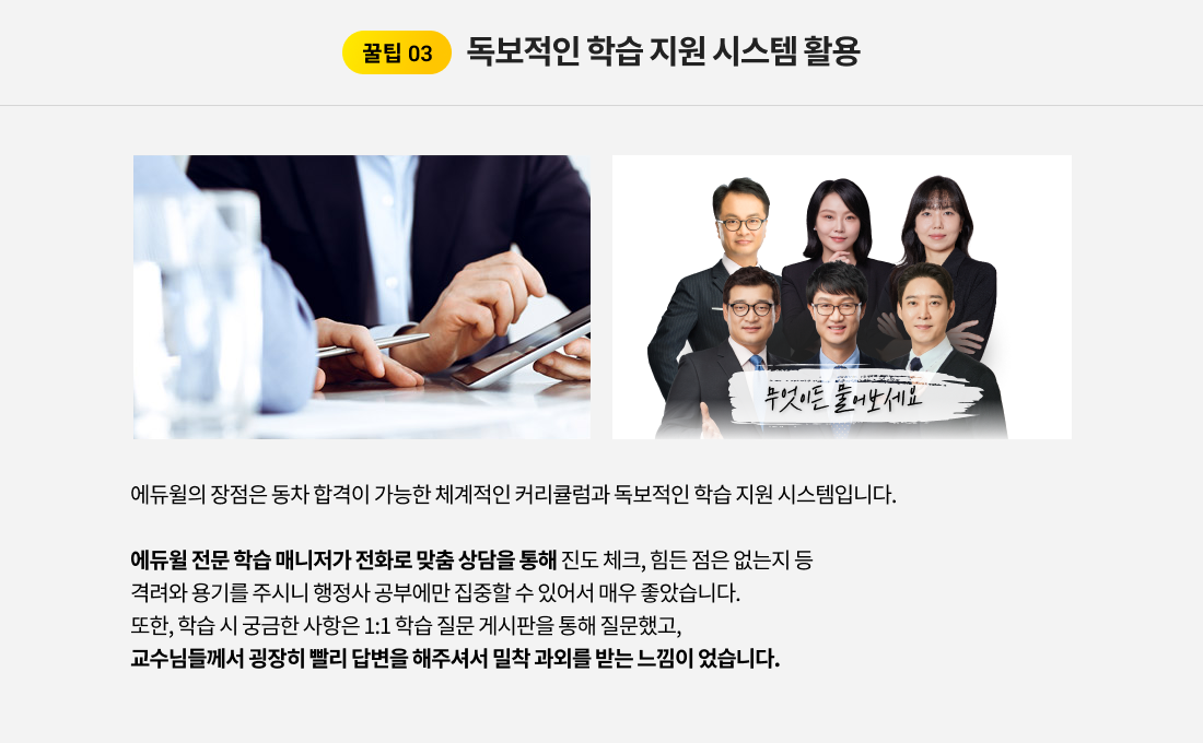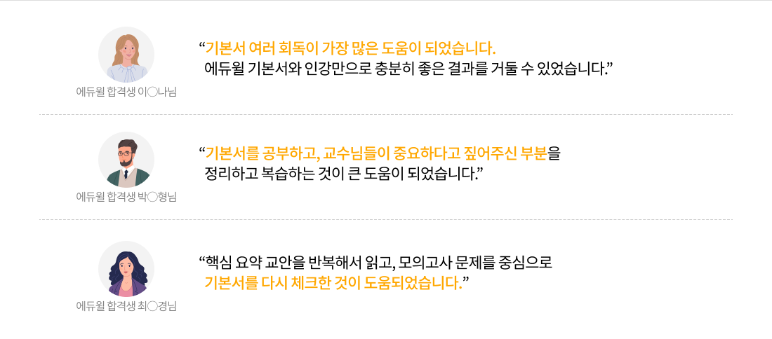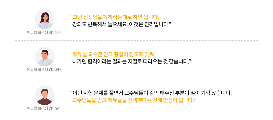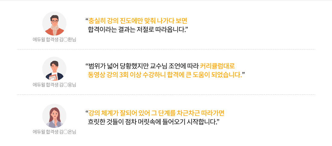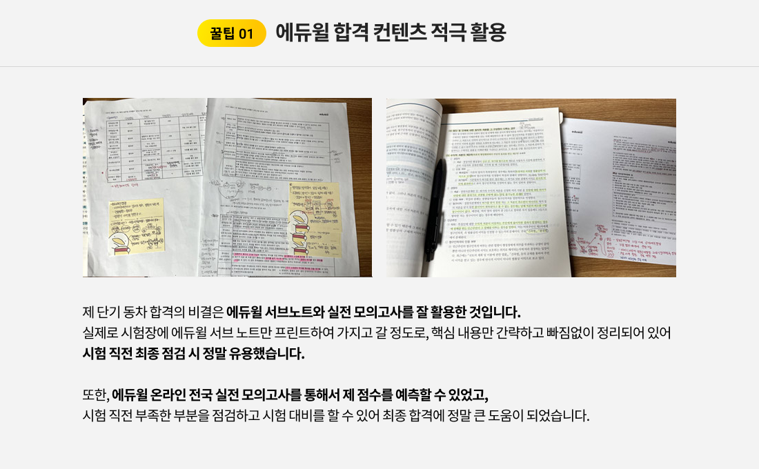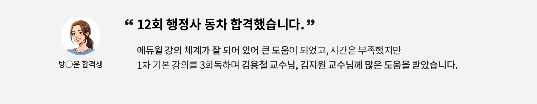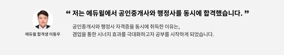 ㈜에듀윌(이하 '회사')에 제공한 합격수기 저작재산권과 관련한 일체의 권리를 회사의 상품 홍보 및 마케팅을 위한 온/오프라인 홍보물 제작에 합격수기 폐기 시 까지 이용하는 것에 동의합니다.