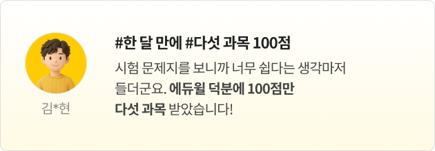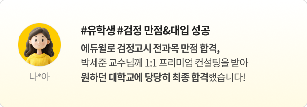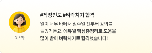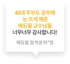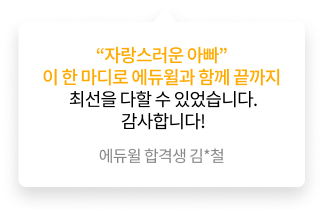 ㈜에듀윌(이하 '회사')에 제공한 합격수기 저작재산권과 관련한 일체의 권리를 회사의 상품 홍보 및 마케팅을 위한 온/오프라인 홍보물 제작에 합격수기 폐기 시까지 이용하는 것에 동의합니다.