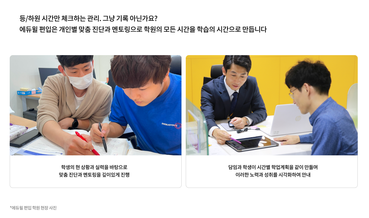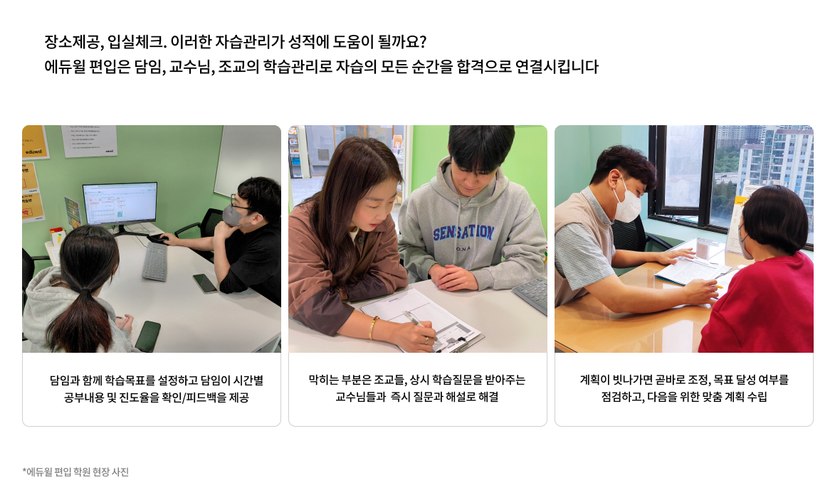 인강만 제공하고 끝내는 관리는 에듀윌 편입은 지양합니다. 인강에 대한 집중력, 몰입감, 성취감, 에듀윌 스페이스 알파에서 합격을 시작하세요.