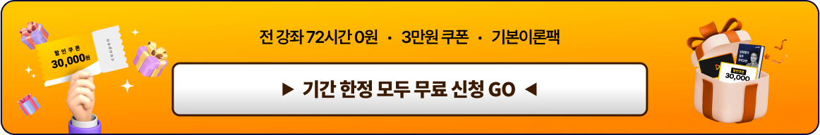 전 강좌 72시간 0원 · 3만원 쿠폰 · 기본이론팩 (이론강의+교안)